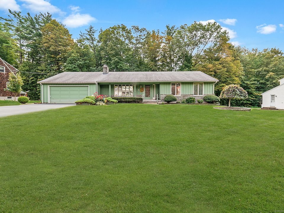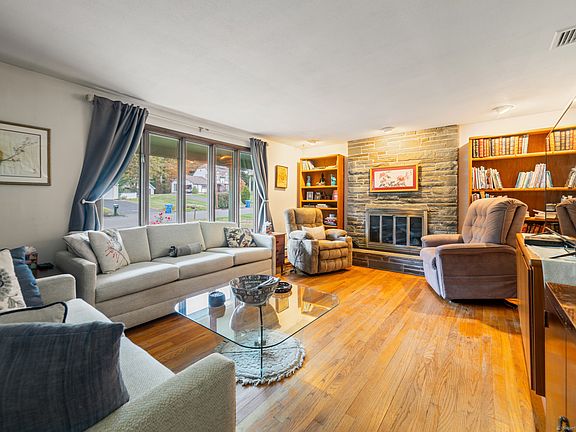 Welcome to this inviting three-bedroom, two-bath mid-century ranch that blends comfort, functionality, and style on a quiet cul-de-sac. The open-concept main level offers a spacious living room with a cozy gas fireplace, a dining area filled with natural light, and a well-appointed kitchen featuring a gas range. Original hardwood flooring extends throughout the main level (except kitchen and baths), adding warmth and character. The primary suite includes a full bath with a shower stall for added convenience and a separate vanity with lighting. Two additional bedrooms provide flexible space for family, guests, or a home office. Laundry on the main level makes everyday living simple. The finished lower level expands your living space with a wood-burning fireplace and plenty of room for gatherings, hobbies, or a play area. Step outside to a covered porch overlooking the level, private backyard-perfect for relaxing or entertaining. Additional highlights include an attached two-car garage, a whole-house generator, and large windows that bring in natural light and overlook the peaceful yard and trees. This home is designed with accessibility in mind, featuring a handicap-accessible full bath with heated floor, and a garage with ramp and railings to accommodate mobility needs. Larger updates since 2017 include a new roof, central air, a new driveway, remodeled bath, and a new burner on the furnace. Don't miss the opportunity to make it yours! Home is heated with oil, propane is for fireplace, gas range, and generator.