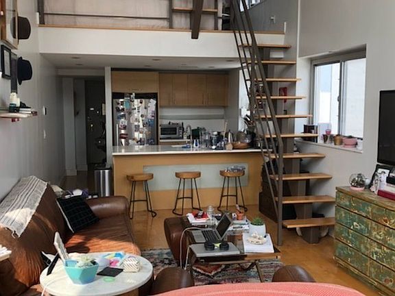 Gorgeous duplex apartment in a super condo-style building. Majestic double-height layout includes a large living area, modern kitchen with dishwasher and stone countertop island. Soaked in sunlight from the massive windows. Includes full bath with tub and a second full bath with shower on the loft floor above. All this, plus ample closets and storage space, and washer / dryer hookups. Current tenants are willing to sell their washer and dryer.