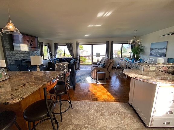 30 days or more only. ONLY DATES AVAIL. Aug. 21st and on. $4200/per month High Tide Hideaway (FURNISHED) with an OCEAN VIEW! Just a six minute walk to Bandon's famous beaches. Only one mile from Old Town and great dining. This recently remodeled two-story home has an open concept design with a well stocked kitchen. This is a 3 bed 2 bath with the master and the main living upstairs to enjoy the view! Electric fireplace. We are very family friendly, one of the bedrooms is set up as a bunk room .We also provide a pack-n-play, portable high chair, and lots of toys and games from toddler to adult. There is even a ping pong and air hockey table. In addition there is a BBQ, beach toys and chairs and an outdoor gas fire pit. Completely furnished and stocked with all kitchen needs. Utilities and internet included. Everything is included. We provide electric, water, direct TV, internet and trash pickup! We also provide linens, towels and toiletries to get you started. We love pets, but they must be approved. This is a no smoking home. 30 day min. Longer times are available. Renter is responsible to maintain property during stay; ie put out the trash, vacuum etc. One time cleaning fee $250. Lots of parking