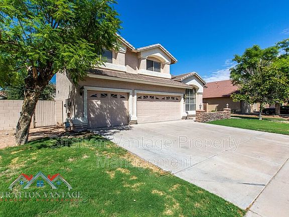 Prime Gilbert Location! This spacious 5-bedroom home is full of charm and functionality. Step inside to soaring vaulted ceilings and a dramatic curved staircase. The main level offers formal living and dining areas, plus a cozy family room with fireplace that opens to the updated kitchen featuring Corian counters, full-height backsplash, abundant storage, and a wine fridge. A full bedroom and bathroom downstairs provide extra convenience.