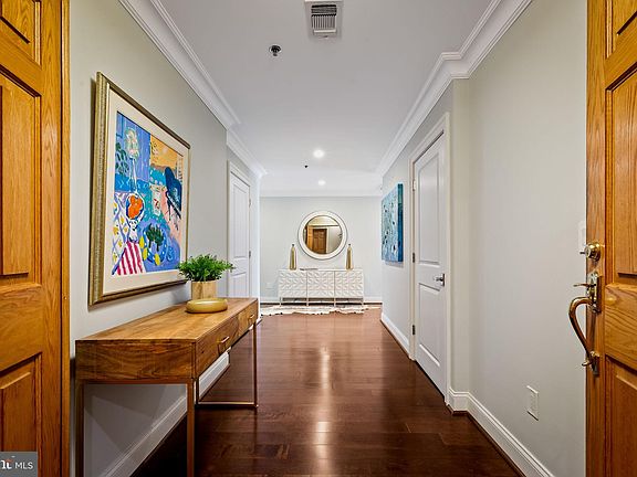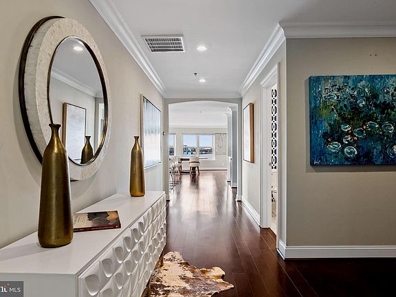 Enjoy sweeping water, marina and city views from this stunning luxury penthouse in Historic Fells Point! Perfectly situated near downtown Baltimore, Harbor Point, Harbor East, Little Italy and Canton, this condo is a walker’s paradise, and is also within close proximity to Johns Hopkins and U of Maryland campuses. The residence offers 2,288 sq. ft. of premier urban living space with unparalleled amenities and materials including engineered hardwood floors, custom cabinetry, crown moldings and window treatments, solid wood doors and LED recessed lighting. Features of the home include spacious hallways for art displays, an open living and dining area with double sided woodburning fireplace, built-in cabinetry, sliding doors to the balcony and a wall of windows to enjoy the breathtaking views. The sleek kitchen is a chef’s delight with an 8 foot Cambria quartz island, stainless steel KitchenAid appliances, oversized range hood, and induction cooktop. A custom bar adjoins the kitchen and includes lighted built-in cabinets and a wine/beverage fridge. Accessed from the hallway is an additional room with newly installed modern sliding doors that create privacy for the space to be used as a den/office and/or additional sleeping space. The room is enhanced with a double-sided woodburning fireplace, skylight, built-in cabinets and a desk. A half bath with Carrera marble inlay floor is conveniently located in the hallway. The spacious primary bedroom includes two sliding doors to access the balcony, a large walk-in closet and a skylight. The spa like bathroom features a Carrera marble floor, large closet and even more storage. Ensuite bedroom 2 has designer carpeting and luxe draperies and shades. The bathroom has a tub/shower with swinging glass partition. The large laundry room contains high efficiency stacked front loading washer and dryer, a sink and plenty of storage. Additional highlights of the condominium are replaced windows and sliding doors, a Sono Speaker System, dual zone HVAC replaced in 2022, neutral paint pallet throughout and a newer hot water heater. The expansive balcony overlooking the water is perfect for entertaining. Firework displays, sailboat races and all marina activity can be enjoyed from various spaces. Building amenities include: 2 unassigned parking spaces as well as parking for guests, a storage locker in the garage, 3 EV charging stations, 24-hour front desk staffing, security cameras, an outdoor pool, exercise room, pool/library room and nicely appointed lobby. Take advantage of this rare opportunity to own a Belt’s Landing penthouse and enjoy Baltimore City living!