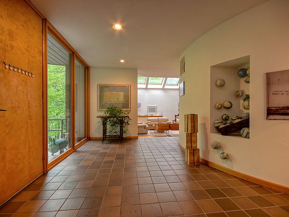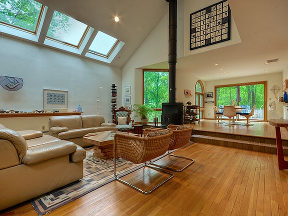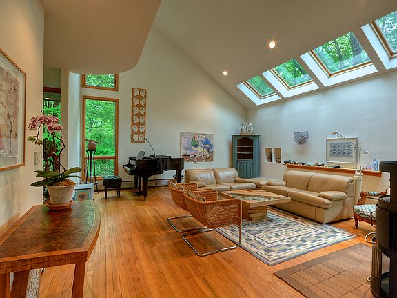Elegant, sky lit artist's Contemporary set on 2 acres of professionally landscaped property with specimen trees and plantings. Adjacent to Edith Macy preserve. Architectural details include: curved walls, high ceilings, floating staircase, walls of glass, open floor plan. First floor master bedroom/bath and deck. Large 2nd floor loft/study. Lower level has separate entry, studio/office/possible 4th bedroom. Central air, above ground oil tanks, deer fencing, and generator. A peaceful setting only minutes to town, train and school