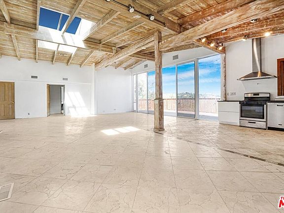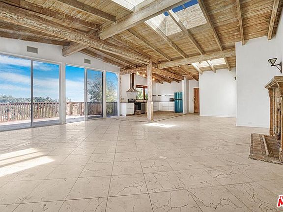 Enter into a spacious great room adorned with a stunning stone fireplace, stone flooring, and soaring pitched beamed wood ceilings enhanced by skylights and recessed lighting. Expansive windows and sliding glass doors seamlessly connect the indoor space to a large deck with a hot tub, where you can soak in breathtaking panoramic views of the Getty Museum. The kitchen boasts brand-new appliances, perfect for culinary enthusiasts. The primary suite offers direct deck access, ample closet space, and an elegantly designed bathroom, featuring floor-to-ceiling designer tile, a luxurious claw-foot tub, and a separate shower. Additional highlights include a skylight in the secondary bathroom and direct entry to a spacious two-car garage where the washer and dryer are located. No sign is on the property. Another house 1 bed 1 bath fully equipped, detached home is located on the lot is also available for lease for $3,500/mo.
