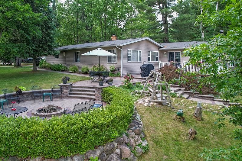 WOW! Check out this outstanding waterfront home on 2 beautiful waterfront lots on Smallwood Lake in Gladwin MI. This gorgeous home features a large open floor plan, spacious full kitchen, lake-facing living room w/fireplace, hardwood floors, living room w/wood a burning stove, spacious bedrooms, open deck, attached garage, detached garage, and so much more! You will love all of the beautiful landscaping, including a gorgeous fire-pit terrace with brick pavers, paver patio, easy steps to the water, more paver landscaping at the lakefront, seawall and a fantastic view. There's an adorable private bunkhouse with it's own little sleeping area for those guests who want their own privacy. Park your vehicles in the attached 2 car garage & store all of your extra items in the detached 24x24 garage with built in shelving. You really have to see this home in person to truly appreciate it! Make your appointment today! Take a FLY THRU DRONE TOUR: https://tinyurl.com/960riversterrace