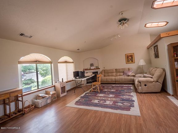 Great home in the charming Town of Clarkdale. Don't miss these fantastic views! Open concept floorplan with vaulted ceilings and gas fireplace in living room. Living room, dining room and kitchen have 3 skylights and large windows bringing in tons of natural light. Dining room has built in hutch. Nice laminate and tile flooring. Oversized laundry room and storage area. Split floor plan with large master bedroom and bath. Go on a hike on nearby trails, or simply take in the beautiful views and relax from this open and covered paver patio area. The back yard has stone and paver walkways, Storage shed and greenhouse with multiple fruit trees, a huge Rosemary bush and native landscape. Home has A/C and swamp cooler.