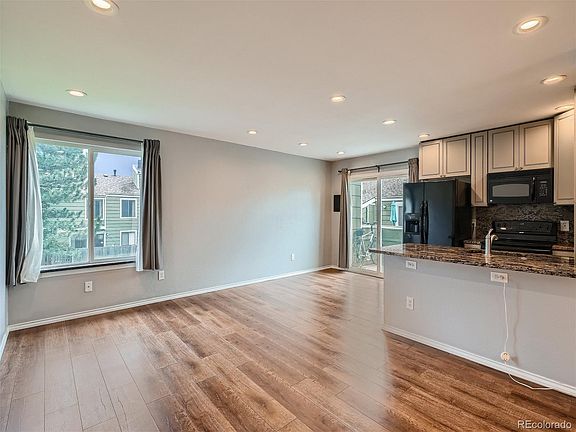 **THIS HOME IS ELIGIBLE FOR A 2% LENDER CREDIT TOWARD RATE BUYDOWN. Ask your agent for details** Cozy, updated condo conveniently located in West Aurora! Enter the front door of this second floor, END UNIT home and you are greeted with light and bright engineered flooring throughout the main living areas. A south facing window brightens the living room with loads of natural light. Get your plants ready! An updated kitchen features GRANITE countertops, tons of STORAGE, and a BAR TOP peninsula that comfortably seats 3-4 guests. A dining area off of the kitchen is perfect for those dinner gatherings or potential office area. Access the generous west facing patio through sliding glass doors. An awesome space for grilling, morning coffee, afternoon cocktail! A patio storage closet is a bonus and place to store all of your outdoor items. The full bathroom has DOUBLE VANITY. A north facing bedroom rounds out this 1bed/1bath and offers a walk-in closet with ample storage and in-unit laundry hooks ups. This space truly lives larger than its square footage! The grounds include lush green belts, playgrounds, and pool! Located very close to public transportation, short drive to I225. Short walking distance to amenities and dining!