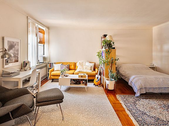 Is this the largest Studio you’ve ever seen? This massive space lives like a full house, perched on a high floor and is located in a well run, community focused, pre-war building. Floating up over the surrounding Brownstones, the space affords bright and sunny open views above the trees. In this apartment, charming means arched entries and original pre-war oak parquet floors with mahogany inlays! The spacious windowed, eat-in kitchen features open views, lots of storage, and dishwasher. After passing through the spacious dressing room you find an updated, windowed bathroom Through arched entry, the main living area its comfortably fits a full living room, a queen sized sleeping space (king possible too), and space for a large dresser The building features beautifully functional amenities, with a large landscaped garden with barbecue area, and multiple social areas. There is bike storage and a laundry room, Butterfly security entrance sends visitors directly to your phone. After living in the building for 2 years, one may sublet the apartment.