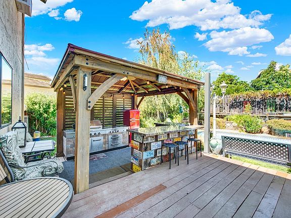 Wood burning fireplaceCorner water featureCeiling fanReal hardwood flooringHuge game roomIndoor laundry roomGazebo with bar