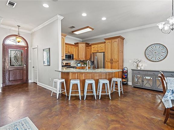 Love to entertain? This 4-bedroom 2.5 bath home on right under a half-acre is for you! This home has an open floorplan with plenty of windows to let in natural light. The master bedroom includes a master bath en-suite with a double sink, shower, tub, and closet with built-in storage shelves. The next two bedrooms are separated with a Jack and Jill bath and one has access to the back yard for guest to be able to use for dressing after a swim in your pool or to get to the restroom. The 4th bedroom could also easily be a great space for an office or bonus room. There is a large Utility/ Mudroom conveniently located right by entrance from back carport. Now for the entertaining...Walk out your back door and enjoy your company by serving some food from your outdoor kitchen while your guests relax poolside. Your swimming season will be extended with the use of your heating and cooling unit. Lastly, there is a storage room by your outdoor kitchen and a detached storage area with a place to park your boat. Flood Zone X and property has never flooded.