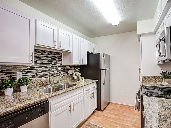 - Exterior features: 24-hr maintenance call center, 24hr maintenance call center, 24hr maintenance emergency service, Ample Storage throughout, Barbecue, Basketball Court, Brushed Nickel Pulls and Fixtures, Business Center, Covered assigned parking, Covered/assigned parking, Designer Mosaic Kitchen Backsplash, Designer mosaic backsplash, Designer mosaic kitchen back splash, Granite Counter Tops, Package Receiving, Professional Management, TV Lounge, Tennis Court(s), Thrmofoil white cabinetry, Woodlike Flooring throughout, covered parking with storage, granite countertops, open layouts and upscale designer lighting, pet-friendly, woodlike flooring and plush carpeting, woodlike flooring throughtout (selected apartment homes)