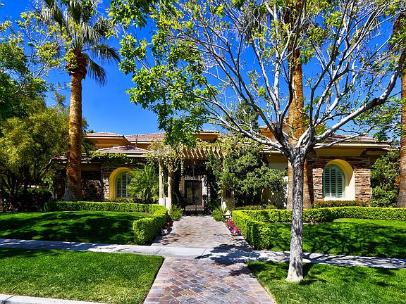 Gorgeous home in the sought after guard gated Canyon Fairways community of Summerlin! This home is loaded with upgrades such as crown molding, travertine flooring, exterior security camera system, built in closet systems, and features 5 large bedrooms (dual masters both upstairs and down) each with a private bathroom and walk in closet. This property is made for entertaining with your own private wine cellar attached to the formal dining room, and Chef’s gourmet kitchen complete with custom cabinetry, walk in pantry, granite counters, Sub Zero fridge, and Viking professional appliances. The heart of the home is the expansive great room which welcomes you with 24 ft vaulted ceilings, wet bar, roaring fireplace, dramatic overhead chandeliers and disappearing pocket exterior doors which open to the resort style backyard with pool/spa, outdoor kitchen with pizza oven, and another fireplace. This property has it all and will not disappoint!