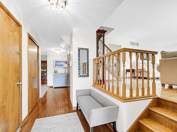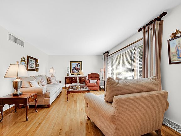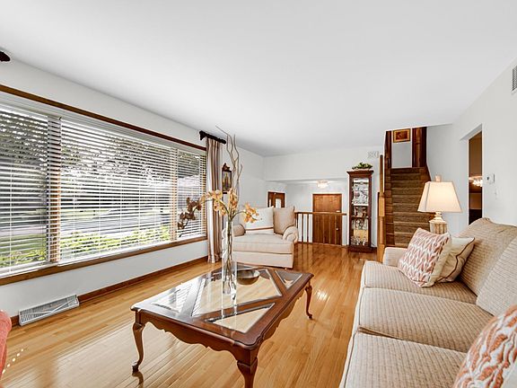 Super clean, move-in ready Quad level on quiet, tree lined street. Entry foyer has newer leaded glass front door. 3 steps up to formal living rm w/huge picture window. Updated kitchen/dining combo w/new cabinets, granite counters, glass tile backsplash, newer Stainless whirlpool appliances, pantry, access to backyard, also open to lower fam rm. Fam rm has carpet, beamed ceiling, masonry fireplace, 1/2 bath, sliders to patio. Nice Hardwood Floors thru most of house. Oak stairs up to 3 good sized bedrooms. Main offers double closets, access to full bath. Basement level is not finished, but has tiled floor for laundry area, great for storage. Attached 2.5 car garage has workbench area. Backyard is partially fenced, has large stamped concrete patio, nicely landscaped. New/newer features include: A/C unit 2021; Water heater 2019; Roof 2018; newer furnace, siding, windows, doors. Continuous upgrades to landscaping. All recently painted, neutral colors. Shows wonderfully!