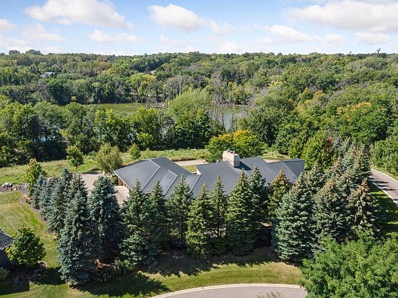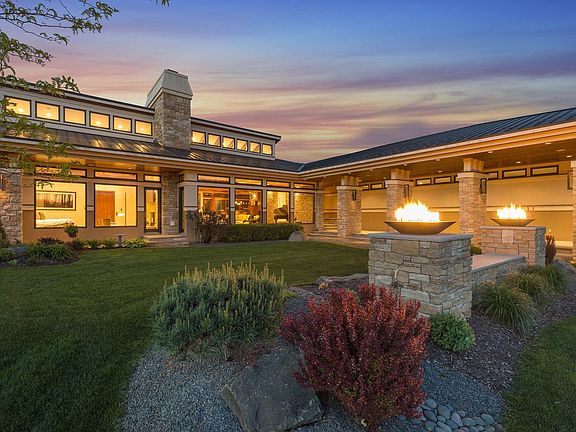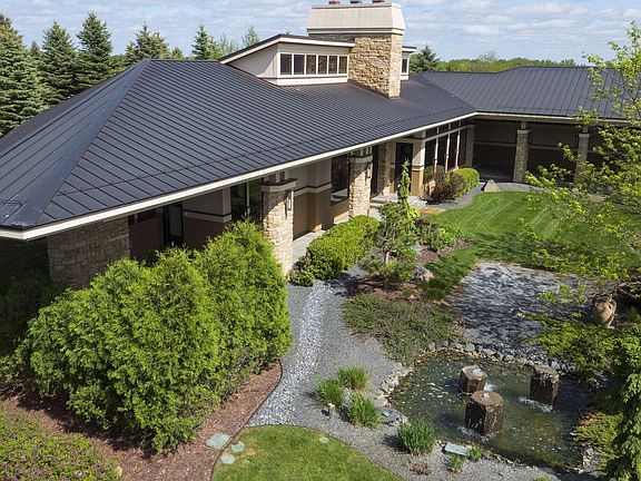 Situated on a large, private lot in the envious Whistling Valley neighborhood, this incredibly unique, prairie-style home displays rare architectural details you won’t find elsewhere. Gorgeous water and landscape features that include two firepots at the entrance are just the start of the grand highlights as you make your way down a long corridor lined with limestone columns and inside to breathtaking spaces. Stand in awe of light-filled rooms that feature vaulted and beamed ceilings, gleaming Brazilian cherry hardwood floors, and limestone piers and walls. The entire home is surrounded by walls of windows that lend serene views of nature and Goose Lake, and in the great room, a floor-to-ceiling, limestone fireplace is a statement piece shared with the master bedroom on the opposite side. Also fall in love with the remarkably renovated kitchen filled with lavish selections of tile, lighting, cabinetry, and countertops, not to mention a stunning wet bar to fulfill your entertaining needs. In addition, a spacious dining area showcases a floor-to-ceiling, tile and copper surround fireplace, along with two adjacent office spaces with beautiful built-in workstations. And located in its own private wing is the deluxe Owner’s suite with separate outdoor access to a tranquil, covered patio; and unwind the day in the dazzling en suite that has been completely remodeled with subway tiled walls, a marble surround shower, freestanding tub, and double vanity- all with top-of-the line fixtures. Plus, a favorable dressing room fulfills all your storage needs with its extensive organization system and offers convenient access to a dedicated laundry room. Other main level conveniences include a handy mudroom with a sink station and tons of storage, a walk-in pantry, remarkable half bath with custom designed walls and vanity, and an elevator that takes you to the lower level that’s full of desired amenities. Enjoy more of those limestone wall features that lead to a cozy family room with a granite surround fireplace, two luxurious bedroom suites with spa-like baths, a Finnish sauna, wet bar, and second laundry room. This wonder of a home is everything you could ask for and more.