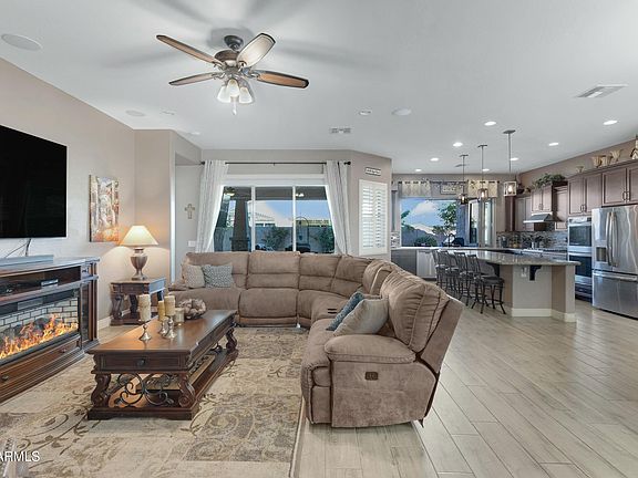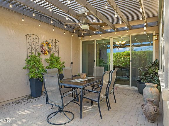 Beautiful home with triple split floorplan in the gated section of Eastmark. This home boasts four bedrooms and three bathrooms, providing seclusion in multiple spaces. The open floorplan of the kitchen, dining and great room are wonderful for sharing meals and quality time together. The kitchen is a chef's dream with upgraded gas appliances, built in double ovens, microwave, and a French door refrigerator. Kitchen cabinets are upgraded, staggered and have crown molding and include roll out shelves and soft close drawers. The granite is upgraded and you will fall in love with the oversized island which serves as the heart of the kitchen. Outdoor entertaining in this home is easy with a side courtyard finished with an overhead trellis, ceiling fan, pavers, and perfect landscaping. Enjoy the back patio which runs the whole width of the home, includes two ceiling fans, a mister system, two gas stubs and a retractable shade. The yard is landscaped with the right amount of turf and shrubs to make the space feel like your private oasis. The front entry has pavers and a trellis cover that is welcoming to your guests. A beloved feature of the entertaining space is the retractable window from the kitchen which operates as a pass through from the indoors to the outdoors. This provides a resort like feel for entertaining. It features its own granite counter top for sharing food and drinks. The primary bedroom has its own entry/exit to the extended patio. The primary bath features executive height, split vanities, a large soaker tub and beautifully tiled separate shower. The large L-shaped closet provides lots of room for belongings. The other three bedrooms are spacious and each have walk in closets and ceiling fans. The secondary bathroom vanities are raised. The home sits on a corner lot across from a community park, has upgraded wood-look tile throughout, while the bedrooms have upgraded, neutral carpet and pad. The rooms feel large with 10' ceilings throughout. Beautiful white wood shutters are installed. There is designer paint throughout the common areas, home is wired for surround sound, and there is a water softener and RO system. The laundry room is a dream size with built in cabinets. The garage has an EV charger, built in cabinets with upgraded shelving and epoxy floors with a lifetime warranty. Experience all that the master planned community of Eastmark has to offer!