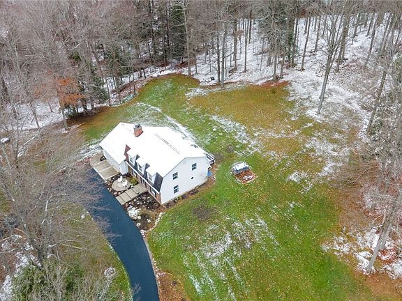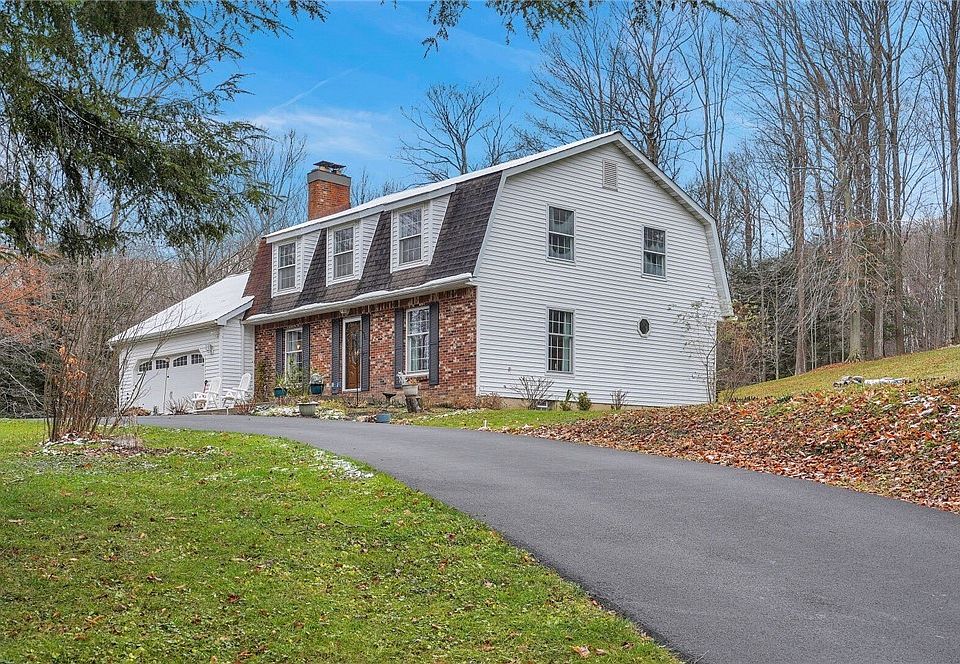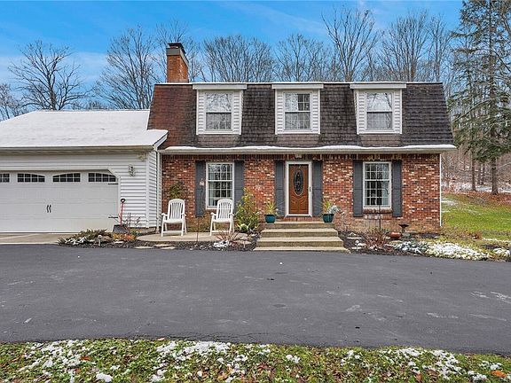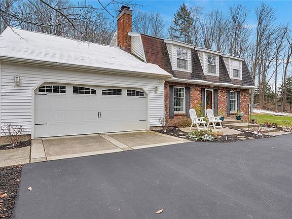 Secluded from the rest of the world, this pristine beauty is nestled on a rolling hillside of nearly 6 wooded acres. A circular drive leads to the 4-bedroom, center entrance, brick and vinyl colonial with a 2.5 car attached garage. A second 2.5 car garage sits at the base of the newly resurfaced driveway. Enjoy a beautiful view from every window in the freshly painted living room/dining room combo. The conveniently located family room with a brick fireplace adjoins the updated kitchen with hardwood floors, newer counters, newer cabinets and sliding glass doors to deck. There are 4 spacious bedrooms upstairs and a newly updated full bath with double vanity. In the partially finished basement you will find a handy shower, workshop area, wood burning stove, bonus room, storage room, newer furnace, hot water tank and water softener. So many updates...newer windows, garage door, front door, sidewalk and front patio are just a few! Alive with color and charm you will enjoy the many perennial gardens! Erie county conservation land adjoins this property to ensure your privacy with snowmobile trails nearby. Offers reviewed as received. Open House 12/17/22 11:00 AM-1:00 PM