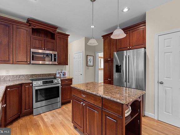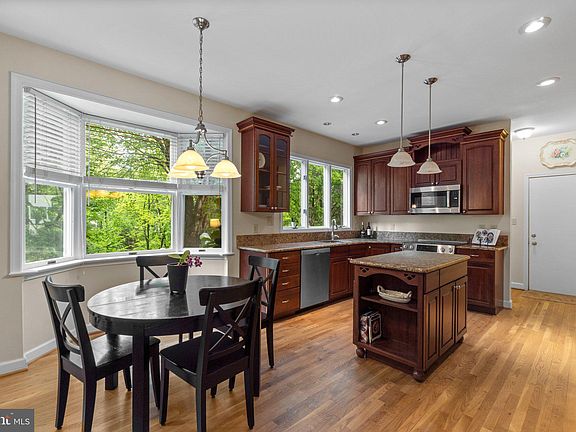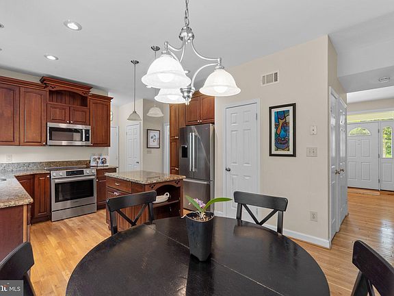 Nestled on a quiet cul-de-sac, this 4-bedroom, 3.5-bath, 2-car garage home offers privacy with mature trees and a serene stream. Enjoy outdoor living on the rear paver patio or deck with updated flooring. Inside, the main level features hardwood floors, a sunken family room with a fireplace (electric insert), and formal living and dining rooms with crown molding and chair rail. The remodeled eat-in kitchen boasts 42" cabinets, granite countertops, a center island, upgraded Bosch stainless steel appliances, and a bright bay window. Upstairs offers four spacious bedrooms, including a primary suite with cathedral ceilings, a dressing area with multiple closets, and a luxurious en suite bath with soaking tub and separate shower. A second full bath features a granite vanity, and new carpet (2024) runs throughout the upper level, which also includes a laundry closet with hookups. The fully finished walk-out lower level includes brand new carpet (2025), a large rec room with wet bar, a third full bath, and generous storage space. Additional highlights include a new gas HVAC (2021), new gas water heater (2018), rear shed/playhouse (2014), gutter guards (2019), and a covered front portico. No HOA fees. Located minutes from Rt 29, I-70, shopping, and dining, and zoned for top-rated Howard County schools: Waverly ES, Patapsco MS, and Mt. Hebron HS.