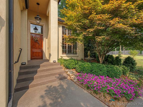 Elegant European style home in Jenks Schools MUST BE SEEN! It is located in a wonderful GATED neighborhood. You enter into a beautiful large two-story great room with 16-foot ceilings and may built-ins, a cast stone fireplace, and Travertine floors. There are 8-foot doors, a first-floor primary bedroom with a HUGE walk-in closet w/dressing area and extensive storage, as well as a beautiful large bathroom. The first floor also has a stately study and very large laundry room. Upstairs there are 2-bedrooms each with it's own bathroom-one has a lovely Juliet Balcony. There is also a game room/den. This home has custom draperies, concrete shingles, extensive crown moldings, and a gorgeous patio with pergola. The home backs to a greenbelt with gated access to a bike/walking path that extends to Riverside Park and Downtown Tulsa.