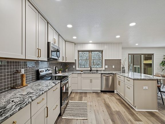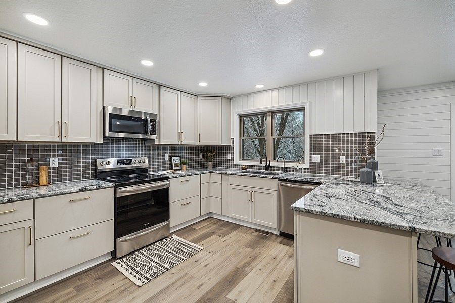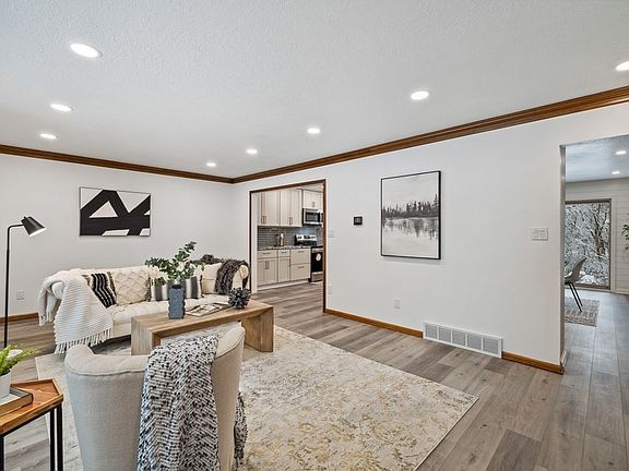 Style, quality, & location w/this COMPLETELY remodeled Golf View Estates split level. Lots of personality w/3460 sf, 4 bdrms/4baths, gas frplc, large kit, 3 fam rm areas, main lvl laundry, and private backyard w/mature trees/walking trail. New drywall/shiplap, electrical updated, paint, LVP flooring, carpet, roof, siding/trim, gutters/downspouts, windows/sliders, front concrete patio, attic/basement insulation, lighting, 2 HVAC systems, tankless H20 heater, H20 softener, RO system, water piping, all bathrms redone, SS stove/dishwasher/micro, kitchen cabinets/granite ctrs/sink, hardware, & more. Have your Realtor give you a list of updates! Kitchen is gorgeous w/maple bisque cabinets w/soft close features, hardware is honey bronze, and granite ctrs w/tile backsplash, and shiplap. Eat-in area is spacious w/access to the fam rm w/frplc, blt-ins, and sunrm w/lots of light. Owners suite is huge w/deck, walk-in closet, ceramic surround shower, vanity w/double sinks, and soaker tub. 3 add'l bedrooms are large w/access to a full hall bath. Near shopping, schools, trails, and parks. Don't miss the opportunity to own a remodeled home in an upscale established neighborhood!
