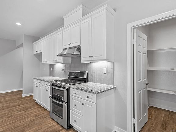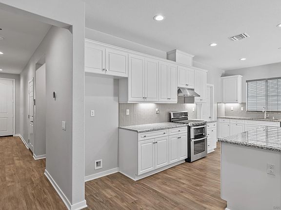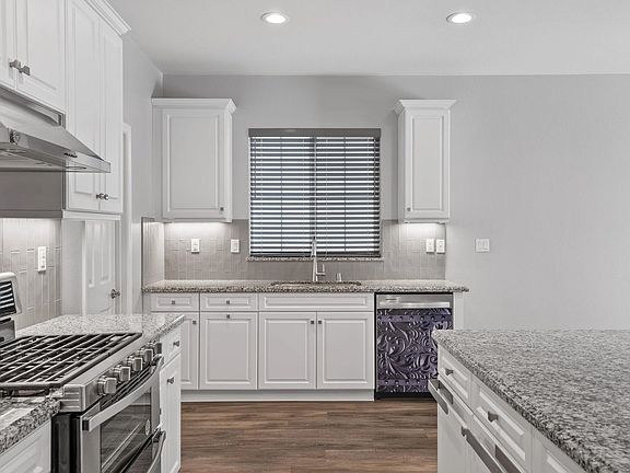 Custom modern paintModern granite countertopsNewly designed kitchenTop-of-the-line stainless steel appliancesBeautiful model home-style backsplashStainless steel ceiling fans