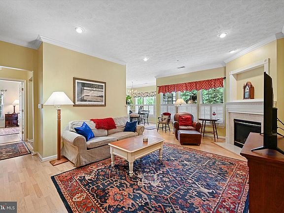 What a location, this 1st floor condo faces the walking trail, trees, and the lovely landscaping just outside of your window/patio. This end unit affords you extra natural light with the side windows in the primary bedroom. Upon entry you are greeted by the foyer flanked with a coat closet and storage closet. The open living area features engineered wood flooring throughout adorned with crown molding, recessed lighting, and a gas fireplace. The updated kitchen features 42" cabinetry, stylish back splash, Corian counters, pantry, rotating shelves, stainless appliances, and so much more all opening to the lovely breakfast/sunroom with chair rail, crown molding and plantation shutters, overlooking the trees and walking path. The formal dining room has been converted to a den with lovely French doors for privacy perfect for a home office, craft room, sewing room, convert back to a formal dining room...whatever your heart desires. The primary bedroom features additional windows afforded by the location and privacy of being an end unit, a lovely sitting room with decorative pillars, walk-in closet, and a beautiful updated full bath with walk-in shower, soaking tub, and dual vanity sinks. The guest bedroom offers neutral decor and another updated bath. A solar shade has been added to the balcony to enjoy your outdoor time throughout the day. No need to worry about shoveling snow or cutting the grass when you live at the Windsor in Perry Hall Farms. This beautifully established community features all brick buildings with elevators, walking trails, spacious floor plans, well maintained common area, secure access entry, all conveniently located within minutes to shopping, library, fitness centers, and of course some neighborhood favorite restaurants. Welcome Home! UPDATES: Refrigerator 2019, Stove 2019, Dishwasher 2019, Washer & Dryer approx. 2015, Water Heater 2017, Plantation Shutters, Solar Shade for patio.