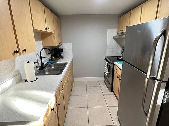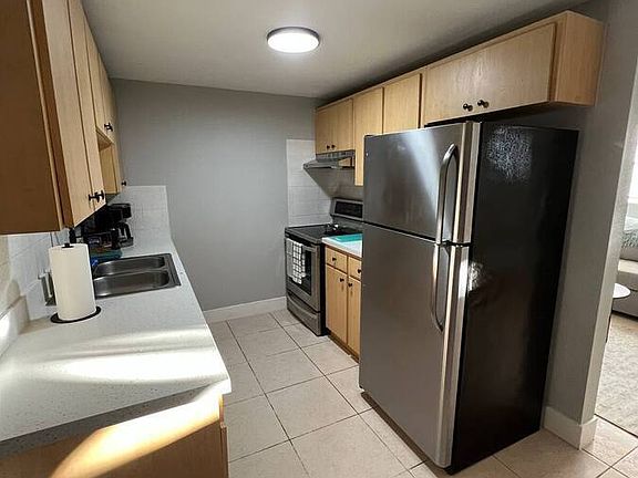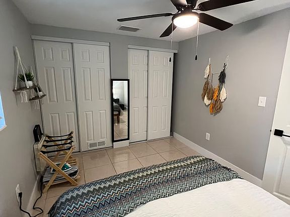 Enjoy a cozy bedroom with a ceiling fan, a sleek galley kitchen with stainless steel appliances, and a modern bathroom with stylish fixtures. Tile flooring throughout, abundant natural light, and a clean, contemporary design make this home move-in ready.