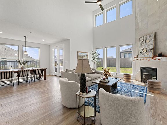 Welcome to 9609 Boathouse Drive, a stunning 4 bedroom, 3 bath home with 2,975 sq ft of luxury living in the highly sought-after Easton Park community just 12 miles from downtown Austin. From the moment you enter through the foyer, this home impresses with soaring 19-foot ceilings in the living room, a dramatic floor-to-ceiling tile fireplace, & an open-concept design that blends modern elegance with everyday comfort. The gourmet kitchen is equipped with upgraded smart stainless steel appliances, pantry with outlets to hide your appliances, & a discreet central vacuum system with wall connections and a convenient kick plate beneath the cabinets for effortless clean-up. A custom wine room adds sophistication, while the media room comes prewired for a projector and already includes high-end surround sound speakers for the ultimate movie nights. The primary suite is on the first floor and features a spa-inspired bath with a soaking tub and a spacious walk-in closet that connects directly to the laundry room for unmatched convenience. Upstairs, 2 additional bedrooms provide comfort & flexibility for guests. The home is designed for modern living with a 2-car garage prewired for electric vehicle charging, full property irrigation, & a rare lot with no neighbor on one side, creating a more expansive yard and openness that is highly desired in Easton Park. The covered back patio is pre-plumbed with gas and water lines, ready for a future outdoor kitchen and perfect for entertaining. Pool plans and quotes are in-hand and ready to create your outdoor oasis! Easton Park itself offers over 350 acres of parks, 13 miles of trails, an expansive dog park, delicious food truck park and The Union, the neighborhood's amenity center featuring a resort-style pool, fitness center, and year-round events. This home combines thoughtful design, high-end upgrades, and a location in one of Austin’s premier master-planned communities—schedule your showing today and experience it for yourself.