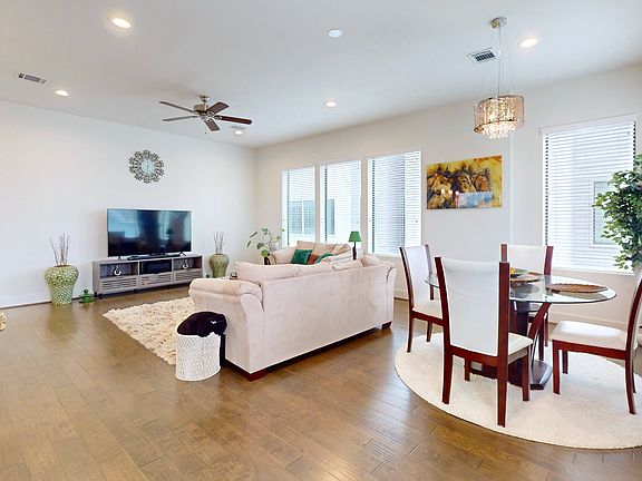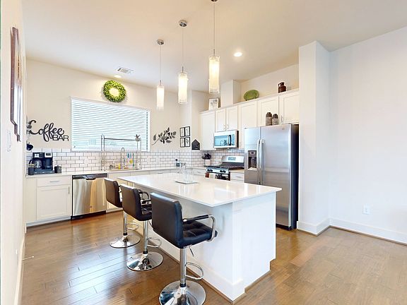Move-in Ready 3 bed 3.5 bath home with many upgrades. First floor has a bedroom and private bath, 2nd floor has a Livingroom, dining area and kitchen with a breakfast bar, quartz countertops, wood flooring, ss appliances, comes with washer, dryer and refrigerator and tall ceilings, the third floor has primary bedroom with ensuite bath, and 3rd bedroom with ensuite bath and laundry room. Easy access to the freeway, close to NRG and medical center in a gated community. Tenant is responsible for all utilities, and trash.