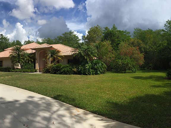 Stunning 2.5 acres on gorgeous grounds in Jupiter Farms on the East side! This custom home built by Jim Monde boasts 7 BRs-one is guest suite w/private entry to screened in pool/spa, 5 baths, 2 car garage, spectacular floor plan, open & spacious family rm, living rm, open light & bright kitchen w/snack bar & generous cabinets, formal dining, well planned master suite w/tankless water heater in master bath, a loft w/2 BR's upstairs w/Jack-n-Jill BA. Features inc hardwood & tile floors, carpet, 3 A/C zones, AquaSoft water system, wood plantation shutters, custom mirrors, plenty of closets/storage space, spacious covered patio, circular driveway, lush landscaping w/natural wetlands in back of property. This is an immaculate home, ready to move in-a must see now. Close to I-95 & turnpike!