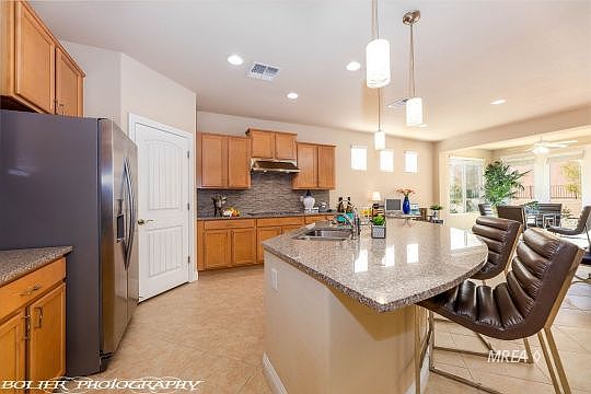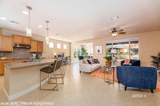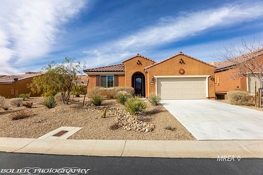 Move-in ready! With 1,717 SF this elegant "Hideaway" is spacious and inviting. Situated on a beautifully landscaped .21 acre lot with stunning views of Flat Top Mesa in the back and the Virgin Mountains at the front and side. The spacious yard offers ample room for a pool and/or a casita. The lot could also accommodate a 3rd car garage. This home has been highly upgraded with a gorgeous SUN ROOM, an upgraded bay window in the Master Suite, a guest bedroom, and a large great room. The Anderson over-sized front storm door allows for plenty of light & gorgeous views of the Virgin Mountains. 4-inch base boards and upgraded Roman doors are found throughout. The kitchen has upgraded granite counter tops, Maple cabinets with pull out shelves and stainless steel appliances. The cook top, refrigerator, cabinet pulls and back splash are a bonus. The home has extended diagonal laid tile flooring, upgraded ceiling fans, window coverings, water softener and Reverse Osmosis. The garage is impressive with a spacious bump out and a large utility sink. This is a must see Sun City property!!