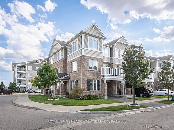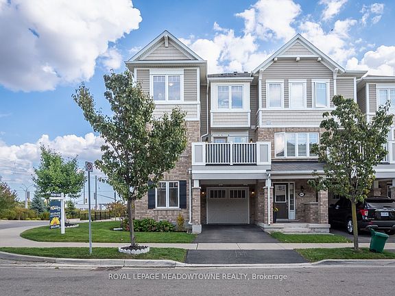 Welcome to this stunning freehold Sutton Corner model townhome located in Milton's sought-after Willmott neighbourhood. This bright and spacious 3-storey corner unit offers 3 bedrooms, 2.5 bathrooms, and thoughtful upgrades throughout. Ideally situated within walking distance to parks, schools, and everyday amenities, plus quick access to the 401, 407, and GO station, its perfect for families and commuters alike. The home features a welcoming covered porch, a large balcony, parking for 2 (garage + driveway), and convenient interior garage access. Inside, enjoy hardwood flooring throughout, pot lights, in-ceiling speakers, and a cozy gas fireplace in the open-concept living and dining area. The white kitchen shines with quartz countertops, tile backsplash, under-cabinet lighting, peninsula seating, and direct access to the balcony. Upstairs, you'll find 3 generous bedrooms including a primary retreat with a walk-in closet and 3-piece ensuite, plus a 4-piece main bath. With a main floor den, laundry, and stylish stone counters in every bathroom, this home blends comfort and function in an unbeatable location.