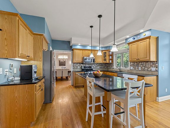 Situated in the sought-after Black Walnut Trails neighborhood, this exquisite home boasts over 3500 square feet of living space on a sprawling 1/3-acre lot. Step inside to discover a haven of elegance and comfort, where hardwood floors grace the entire main level, offering both convenience and easy maintenance. The grandeur of the 2-story foyer sets the tone for the home's upscale ambiance, leading seamlessly into the vaulted step-down living room, complete with a bay seating area and hidden storage. Adjacent, the spacious dining room with its tray ceiling provides the perfect setting for gatherings with loved ones. The open eat-in kitchen is a culinary delight, featuring an extended island, breakfast bar seating for five, granite counters, tile backsplash, and abundant cabinet space, illuminated by recessed and pendant lighting. A bayed eating area overlooks the yard, with easy access to the patio for outdoor dining. The family room offers cozy seating options and a charming brick gas fireplace, ideal for relaxation. The main level also hosts a den with built-in wall units, a convenient half bath, and a laundry room equipped with a sink and a handy laundry chute from the second floor. Upstairs, newer carpeting adorns the four spacious bedrooms, including an oversized owner's suite boasting a walk-in closet and a luxurious bath with an updated shower and double bowl vanity. Three secondary bedrooms impress with their size, two offering additional dormer seating with storage, while an additional vaulted bedroom provides access to floored attic storage. The finished basement expands the living space, featuring a large rec room, a separate office/workout room, and a generously sized additional bedroom/bonus room with a closet. Ample storage is provided in the lower level's large storage room. Outside, the vast side yard invites outdoor play, while the garden paver brick patio creates an enchanting setting for entertaining guests. This exceptional home enjoys a prime location close to parks, basketball courts, and a serene pond, with easy access to community amenities and the tollway, ensuring a lifestyle of convenience and luxury.