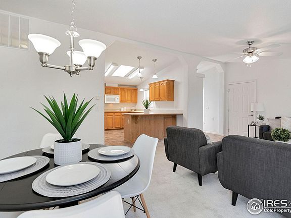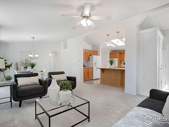 open house Sunday 8/27 10:30-12:30. Wow best price in the neighborhood--Dont miss this low maintenance manufactured home in the gated 55+ community of Sunflower. Seller is including a 1 year home warranty for buyers peace of mind. This community is very clean and well maintained. This home is 2 bedroom/2 bathroom/ 2car garage with a fenced yard. The living room features a vaulted ceiling, ceiling fan & flows nicely into the dining room & large kitchen. This home has been well maintained -(original owner) . The primary bedroom is at the back of the house and features vaulted ceiling, walk in closet, en-suite bathroom with double sinks and walk in shower. The laundry room & additional storage area are conveniently located b/w the kitchen and primary bedroom. Enjoy your side patio and low maintenance fully fenced yard. All the yards are different in here so add or subtract as you want. The community center is beautiful & offers activities such as: pickle ball, putting green, exercise room, craft room, hot tub, cards, game night, dance lessons, art classes and more. Please note the community is on a land lease- cost is $1067/monthly. This is a very quite location at the back of the community, 10 mins to Old Town Fort Collins or access I-25 in minutes from your door.