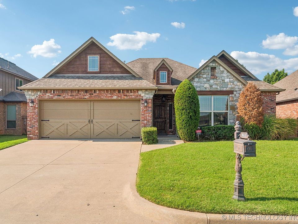 Gated one story home in desirable Spicewood Villas; a small quaint neighborhood in south Tulsa. Properties for sale in this neighborhood are a rarity! Exterior is timeless full brick and stacked stone. Spacious entry with tile which leads to open living concept with living room, dining and kitchen. Engineered hardwood floors in living, fireplace with gas logs, and tray ceiling. Granite counters and pantry in kitchen. Utility room with sink conveniently located near primary bedroom. Primary bath with soaker tub, separate shower and large vanity with double sinks. Split floorplan with 2 bedrooms and hall bath. Covered patio, floored attic area, security and sprinkler systems. Low maintenance home with HOA fee that covers front and back yard mowing. This lightly lived in home is a must see. Perfect home for down sizing. Carpet allowance with acceptable offer. Cameras in use.