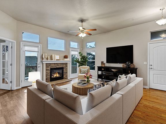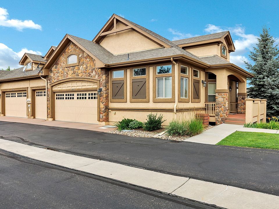Beautiful Ranch Patio home located in the Carriages at Pine Creek. 3000 Finished square feet with 3 Bedrooms plus a main level office. Open floorpan with lots of windows, 2 gas fireplaces, walk out deck, kitchen with counter bar, wood floors, and pantry. Main level master retreat with sitting area, 5 piece bath with jacuzzi soaking tub and closet organizer. Large family room in the basement with walk out covered patio, wet bar, 2nd gas fireplace and shutters on windows. Two extra large bedrooms in basement. Additional features include air conditioning, 3 gar garage, main level laundry, and exterior maintenance.