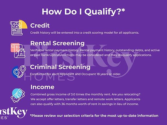 FirstKey Homes, LLC is an Equal Housing Lessor under the FHA. Applicable local, state and federal laws may apply. Lease terms and conditions apply. This is not an offer to rent—you must submit additional information for review and approval. Listed features may not be accurate; confirm details with a leasing representative. Certain cities and municipalities – including St. Louis and Chicago – require a home inspection prior to a new resident taking possession of the home. If you are leasing a home in one of these areas, please note that your move-in date could be adjusted to accommodate inspection requirements. Please ask your leasing agent for more details. BEWARE OF RENTAL SCAMS: FirstKey Homes exclusively manages our homes (no third-party management). We do not lease homes through Craigslist, SocialServe, LetGo, Facebook Marketplace or other classified advertising services. We will never ask for wire transfers, cash apps like Venmo, Zelle, CashApp PayPal, or any other transferring method to collect funds. See FirstKey Homes website for full details and conditions. Listing photos are provided to help you select a home; all photos shown are for representative and illustrative purposes only but may not be exact. Colors and photo size may vary based on different resolutions, hue, brightness, contrast, or other photo variations. Photos on websites may be modified, changed, or amended at any time. For new construction homes, actual homes may vary, photos may be of similar home/floorplan, home may be under construction and photos may not be of actual home, individual homes, amenities, features, and views may differ. If you have any concerns, please schedule a tour prior to applying or leasing the listed home.