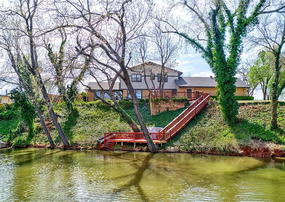 Chuck Norris slept here!--Literally. 2nd owner of this home was Chuck Norris's cousin. Chuck was a frequent visitor. This lakeside estate, located on almost 1/2 an acre, is spectacular with picturesque panoramic views of the lake & private dock. This contemporary designer owned home is stunning. Each room is a lesson for interior designers & home owners as to what home interiors should be. A wall of windows frames the formal living rm. The living rm features wood plank floors, fireplace, crown molding, surround sound & wet bar. The exquisite formal dining as part of the living rm makes for seamless entertaining. The den begs for movie nights & family game nights. A wall of built-ins and patio exit to the outside deck & lake make the den a favorite room. Quintessential Master with sitting rm, fireplace, double vanities, whirlpool & shower, huge walkin closet. 3 beds 2 baths up. Private dock for fishing and boating on the lake. Special Place.