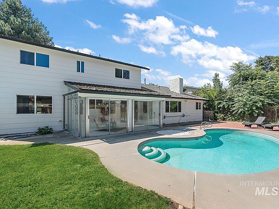 OPEN HOUSE 8/26 Sat 1-4pm & Sun 8/27 1-4pm. Centrally located rambling ranch style home with easy access to Chinden close to shopping, schools and restaurants in both Meridian and Boise. Cheerful light welcomes you into this move in ready, vibrant open concept home with pool. The kitchen is the heart of the home, located in the center of the house overlooking the well appointed back yard. The seamless flow between the kitchen, family rooms, dining area and sun room is ideal for entertaining. Unwind in the front facing family room which overlooks the large covered front porch. Warm up by the cozy fireplace with custom brick work and built in book shelves in the rear facing family room with view of the pool. Private owners ensuite will delight with spacious bathroom and views of Bogus. Go for a swim in the pool or relax in the spacious fully enclosed sun room. Oversized 2 car garage with 1/2 bath and storage room. RV parking!!! Just painted inside and out along with new carpet!