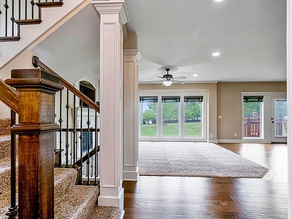 Original owner of this BEAUTIFUL 2 STORY that offers a BEDROOM and FULL BATHROOM w/ shower on the MAIN LEVEL...home in the Liberty North district. So much natural light floods this very open floor plan. Upon entry you will enjoy a spacious great room, formal dining and a kitchen with island & granite countertops. Don't miss the butler's walk-in pantry w/convenient pass-through window from garage making easy grocery storage. Beautiful HDWD FLS in entry and kitchen. For the personal chef an extra backup kitchen is installed in the garage on the third car side. Large Primary bedroom and massive spa like bathroom double vanities, double closets his and hers, large whirlpool tub, large walk-in shower. 2nd level laundry room has space for hanging clothes. Bedroom-level laundry is connected to the primary closet for convenience. 3 additional spacious guest rooms, 2 bedrooms share a jack and jill bathroom with shower/tub combo while the 4th bedroom offers private guest suite includes its own HUGE walk-in closet and bathroom offers a shower. Newly finished basement offers a massive Rec / theater space full bathroom with shower and a 6th conforming bedroom. Enjoy watching the big game in the finished basement w/mounted projector, and ambience theater lighting, surround sound and receiver. Plenty of storage. Irrigation covers full yard.