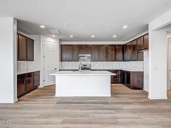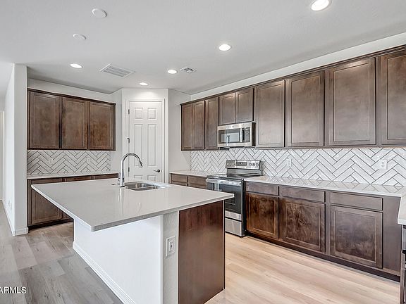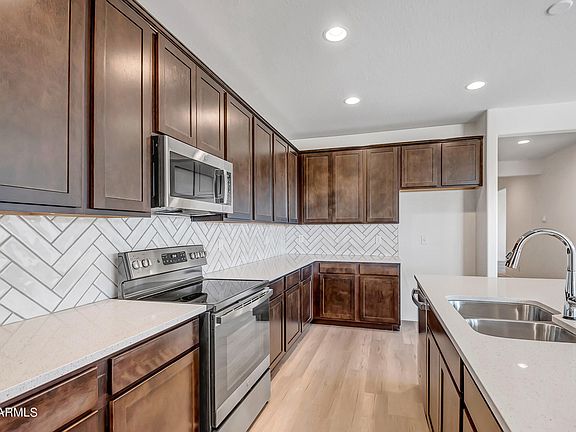 The Fable is the most popular single-story plan here at Enchantment, come see why for yourself! It offers you 4 Bedrooms, 3 full Baths, a Super Laundry, a spacious Owner's Entry, PLUS a Teen Room/Media Room and 2+ car Garage! Your brand-new home is on an oversized lot with single-story homes on either side with a North/South exposure. Luxury Vinyl flooring throughout and upgraded carpet/pad in all Bedrooms. Your Kitchen boasts 42-inch shaker cabinets, Ice Quartz countertops and the backsplash is a 3x12 subway tile set in a beautiful herringbone pattern, Electric range and gas stub. All in the award-winning master-planned community of Eastmark - Call To Set Up Appointment before it's gone!! Ready NOW!! Want more info, CALL US!