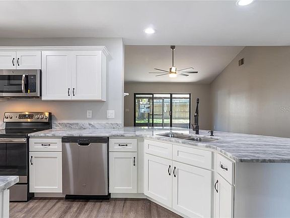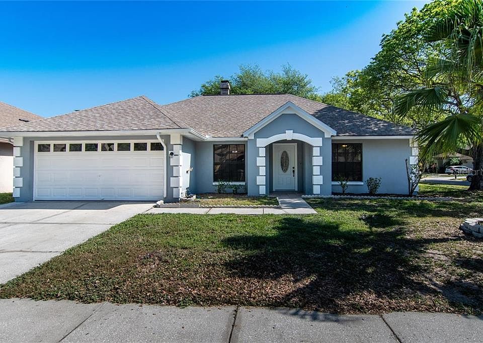 Stunning Move-In Ready Home! This 3 Bedroom 2 Bath 2 Car Garage house is perfectly situated in the Pebble Creek Golf Community. As you walk into this fully updated property you will notice the new luxury vinyl floors and the first living room to your right and dining room that greet you to the left. The eat-in kitchen highlights are the shaker cabinets, sleek grey granite counters, new stainless steel appliances and overlooks your second living room with a fireplace. The upgrades continue as you enter the master bedroom and bathroom that features a double vanity, large soaker tub and separate glass enclosed walk in shower. The second bathroom also embraces unique and modern tile work that adds extra character to this house. Sliding glass doors lead you outside into the fenced yard. Other notable items are the indoor laundry, new HVAC, new interior/exterior paint and new bronze lighting fixtures throughout. Centrally located in New Tampa to restaurants, shopping and highways.