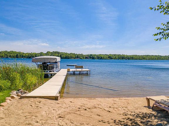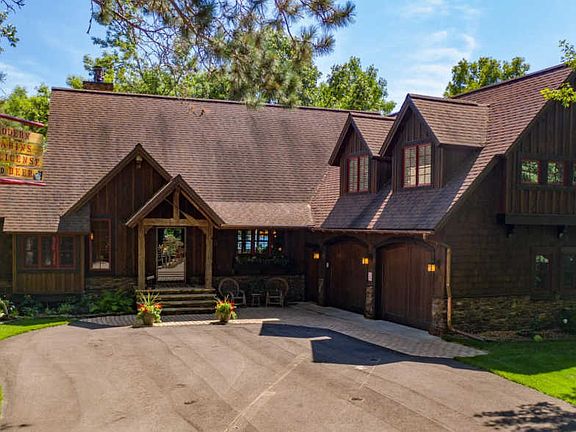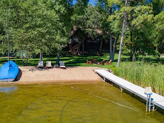 Distinctive custom designed home by renowned Architect & Author of 5 books on the Family Cabin, Dale Mulfinger, is one of a kind. You will be wowed by the front door designed & created by Jeff Kreitz & custom made of chestnut wood from a pre-civil war tobacco farm & the antique reclaimed timbers & flooring from species including oak, fir, alder, black walnut and cedar. Great room w/ its wall of Montana Ledgestone FP & lakeside windows & doors that open to a large screened porch & lakeside deck brings the outside in. Gourmet kitchen has Wolf & Sub-Zero appliances & the center island is Black Walnut. Master suite has a gas FP, desk nook & luxury bath. Large family room has a full wet bar including, refrigerator, ice maker, dishwasher & microwave & a 3rd gas FP. 3 guest BRs and 3 BAs on the lower level. The bunk room has sleeping for 8 w/built-in beds & its own bathroom. Pristine lot has perfect elevations to a sand beach & a portion of shoreline restored to native plantings.