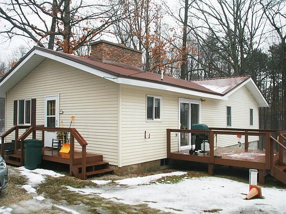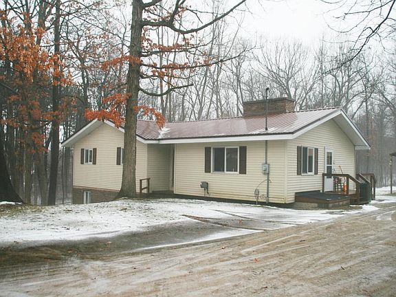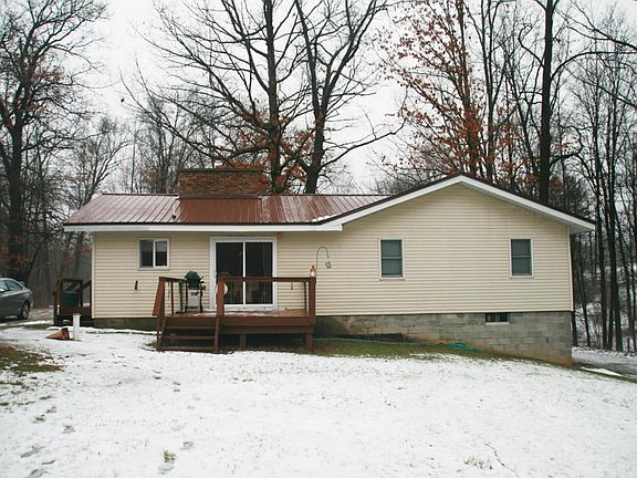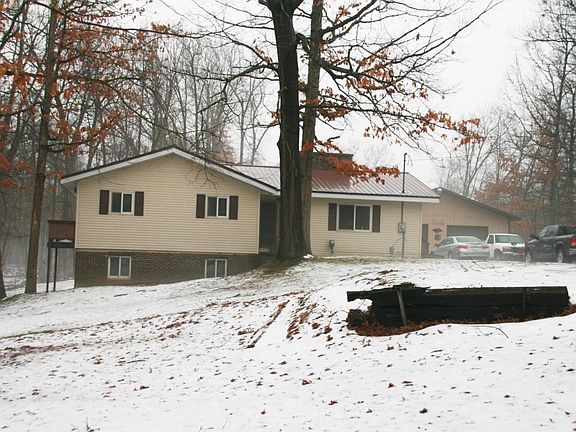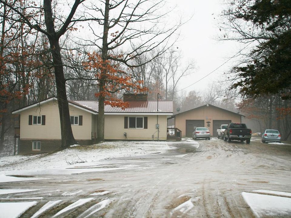 Well built custom home on over 5 wooded acres features: 3 bedrooms; 3 bathrooms; natural gas or wood heat; large brick fireplace with gas log; newer well; newer metal roof; walkout basement; new blinds; leaded glass entry light; appliances included; remote fans; decks; updated floor coverings in parts of home; custom barn wood cabinetry; 32' x 40' pole barn with electric, concrete floors, engine hoist trolley, air compressor with piping, shelving and heated. Also includes 24' x 31' lean too with garage doors. Country living yet close to town. Car hoist in garage is reserved by seller.