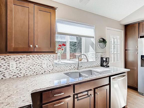 Updated 2 bedroom, 1 bathroom ranch style end unit home is completely renovated and updated. Newer - cabinets & appliances with granite counter tops. The dining area extends into the living room with its newer gas fireplace, vaulted ceiling with skylights - all hardwood floors on the entire main floor. The bathroom has a 60" shower, extended marble vanity and tile floor. The two nice sized bedrooms have large windows to give it extra light. Private fenced patio which backs to open space. Enjoy the community pool and club house - 1 reserved parking in front of the home plus extra guest parking. Great location - close to shopping, restaurants, Chatfield State Park, hiking, C-470. Move-in ready! Home Buyer Warranty Included.
