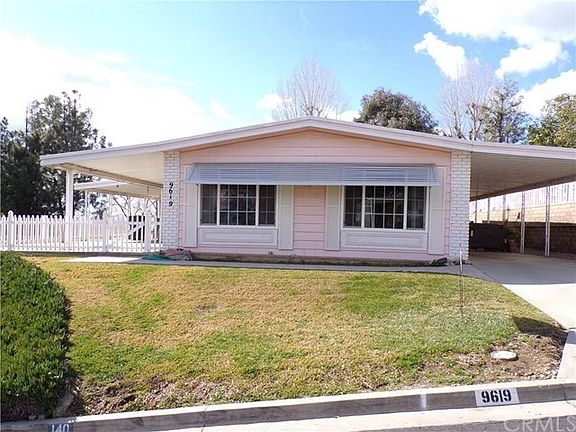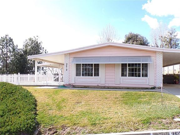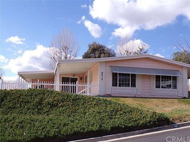 located in one of Calimesa's desirable 55+senior communities-Sharondale where you own the land. Top of the hill, views over looking the community and hills. Front door entrance from covered patio to open living room combo dining area with a built in hutch. Kitchen features a pantry with a trash compactor inside, gas stove, dual sinks, has breakfast counter bar, and window above sink. Open to family room, with a wet bar, and sink, holders for wine bottles. Master bath has soaker/garden tub, plus a separate shower, dual sinks, lighted vanity, built in clothes hamper. Master bedroom, has large Walk in mirrored doors, closet with organizers and built in dresser. Jack and Jill bath from laundry area to guest bedroom. Larger shower in guest bath with dual seats. Dual pane windows. Separate entrance from carport through laundry room area. Covered fenced Patio and covered carport. No neighbors directly behind home, nice greenbelt overlooking community.