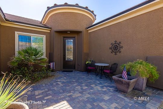 Located on a fully landscaped lot with panoramic mountain views, this Serenity model in Sun City is fully upgraded. The extended pavered patio is great for entertaining and back yard eastern exposure is perfect. Enjoy the tranquility of the custom built water feature and know there is room for a pool if desired. The pavered front courtyard has beautiful views of Flat Top Mesa and being located in a quiet cul-de-sac is appreciated. Upgraded large tile runs through out the home and neutral paint tones warm the space. This open floor plan offers 3 bedrooms plus a den/office space and the spacious kitchen is a dream. All stainless appliances are included and the oversized granite covered island is gorgeous. Two impressive bay windows in the master and the dining area add great natural light. The master suite is spacious and the ensuite is impressive with a stunning walk-in tile surround shower. The garage is extended and the additional "bump out" space is awesome for additional storage.