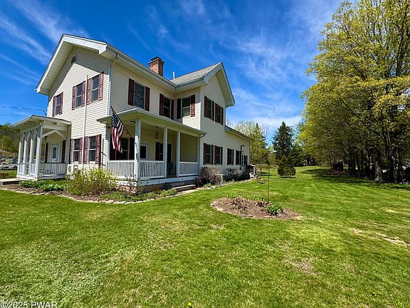 HISTORIC COLONIAL ON THE LACKAWAXEN RIVER! Set on more than 2 picturesque acres along the tranquil Lackawaxen River in the quaint hamlet of Aldenville, this beautifully preserved home blends timeless elegance with everyday comfort. Once a flourishing bed-and-breakfast, the property has been lovingly transformed into a welcoming private residence filled with warmth, character, and charm. From the moment you enter the grand foyer, you're drawn into the inviting living room through the beveled stained glass door, where a marble and brick wood-burning fireplace sets a cozy tone. Three covered porches offer peaceful spots to relax, entertain, or simply take in the surrounding natural beauty. With four bedrooms--three featuring private en-suite baths--and a dedicated craft or recreation room, the home offers flexible space for both family living and hobbies. The farmhouse-style kitchen invites gatherings with a charming pellet stove adding to the cozy, lived-in feel. Character-rich details like wide-plank floors, a handcrafted wooden staircase, and stained glass accents showcase the home's rich heritage and thoughtful preservation. The detached two-car garage includes a full bonus room above, ideal for storage, a workshop, studio, or creative retreat. Outdoors, the property offers level, open space with mature landscaping, a dedicated garden area, and easy, direct access to the river--perfect for relaxing and connecting with nature. Step out your back door and wander down to the edge of your private riverfront where the scenic Lackawaxen River offers an angler's paradise with both wild and stocked trout - nature's playground right in your own backyard. Conveniently located near Honesdale and US Route 6, the home is just minutes from Prompton State Park's scenic trails, lake access, and picnic spots--and only a 35-minute drive to Elk Mountain Ski Resort.
