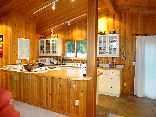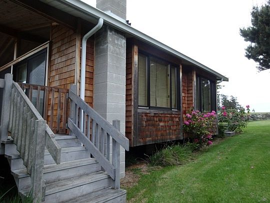 Contemporary nicely remodeled waterfront home w/airplane carousel & off site hangar. Critique landings & take-offs. SW exposure gives you year-round sun & superb marine & sunset views. Exterior is cedar shingles turning a mellow grey to match the expansive decks & railings. Interior is cedar T&G. Slate/Carpet floors. Kitchen w/butcher block counter tops. Propane range & forced air heating. Wood stove backed by river rock. Charming guest quarters w/wood stove and river rock. Path to pebble beach.