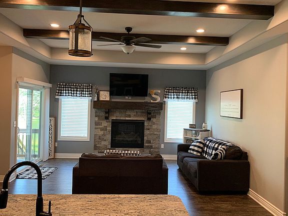 Essentially NEW, this *LAKE VIEW* home was built in 2017 and boasts high ceilings, beam-detail, and the best finishes. Luxury vinyl flooring throughout the main living room and kitchen... granite countertops with stainless steel appliances, large pantry, and beautiful woodwork and wide trim. Split bedroom floorplan with separate master bedroom en suite with corner soaker tub, double sinks, and walk-in shower. Master bedroom closet walks through to the main floor, separate laundry room. The BEST of entertaining space is in the WALK OUT basement ~ providing a gorgeous wet bar with plenty of rec / family room space. 2 more large bedrooms and full bathroom finish the lower level. This lake view backyard is fully-fenced. Spend your evenings on the sprawling covered deck, complete with bluetooth speakers and recessed lighting. Schedule your showing today on this quiet cul-de-sac with beautiful views of the water behind. . .