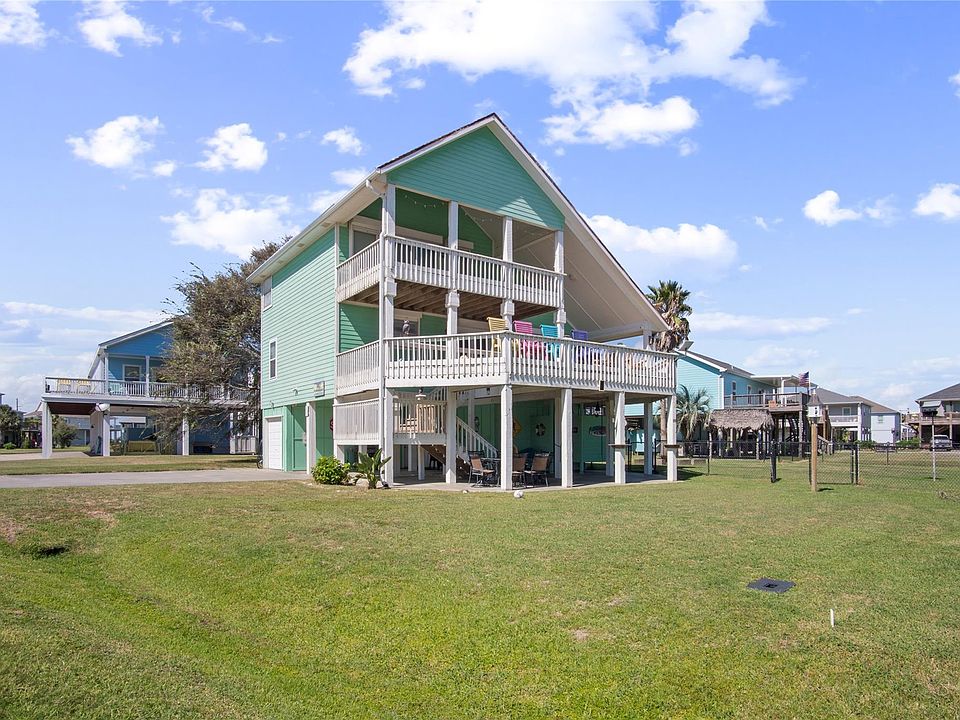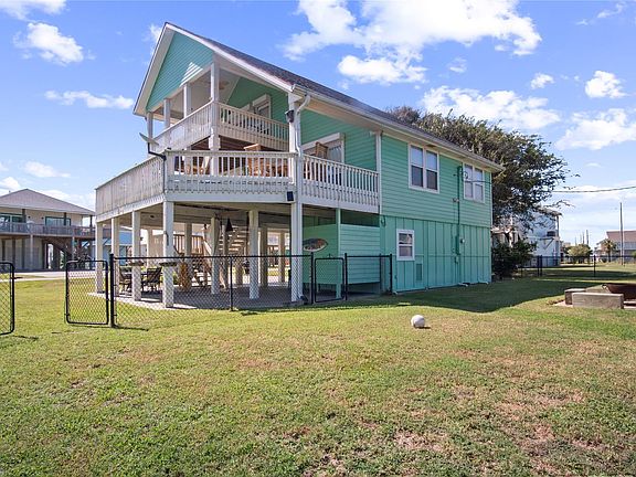 Awesome floorplan on a huge 10,000+ sf lot, fenced, with firepit area! This lovely home has plenty of space inside & out! Enjoy the views from the large deck with beach views with your morning coffee! Inside you'll love the open space with lots of windows and high ceilings. Kitchen has lots of storage and is super functional. Laundry offers great storage closet. Living/Dining/Kitchen plus 1 bedroom on first level. Second level is a private primary suite with king bed & additional bunks plus balcony with amazing gulf views! You'll love the outdoor entertaining space with sand shower, open area for cook-outs, garage + storage and only a 2-minute golf cart drive to beach access! Home has storm shutters on the south side, comes mostly furnished and ready to go! This home is also grandfathered in as a (A)flood zone! Centrally located in Crystal Beach close to restaurants, shopping and so much more!