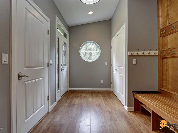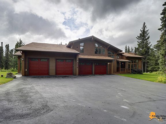 This architecturally appealing home with adjoining wing is situated on 2+ acres in a park-like setting. 5 BD (poss. 6th), 3.50 BA, sunroom, fireplace and woodstove. Vaulted ceilings with exposed beams. 4 car garage w/mezzanine storage. New septic and heating system. Fenced yard, patio, 2 large decks, RV parking, storage shed. Minutes to Hilltop Ski Area, AK Zoo and numerous parks.